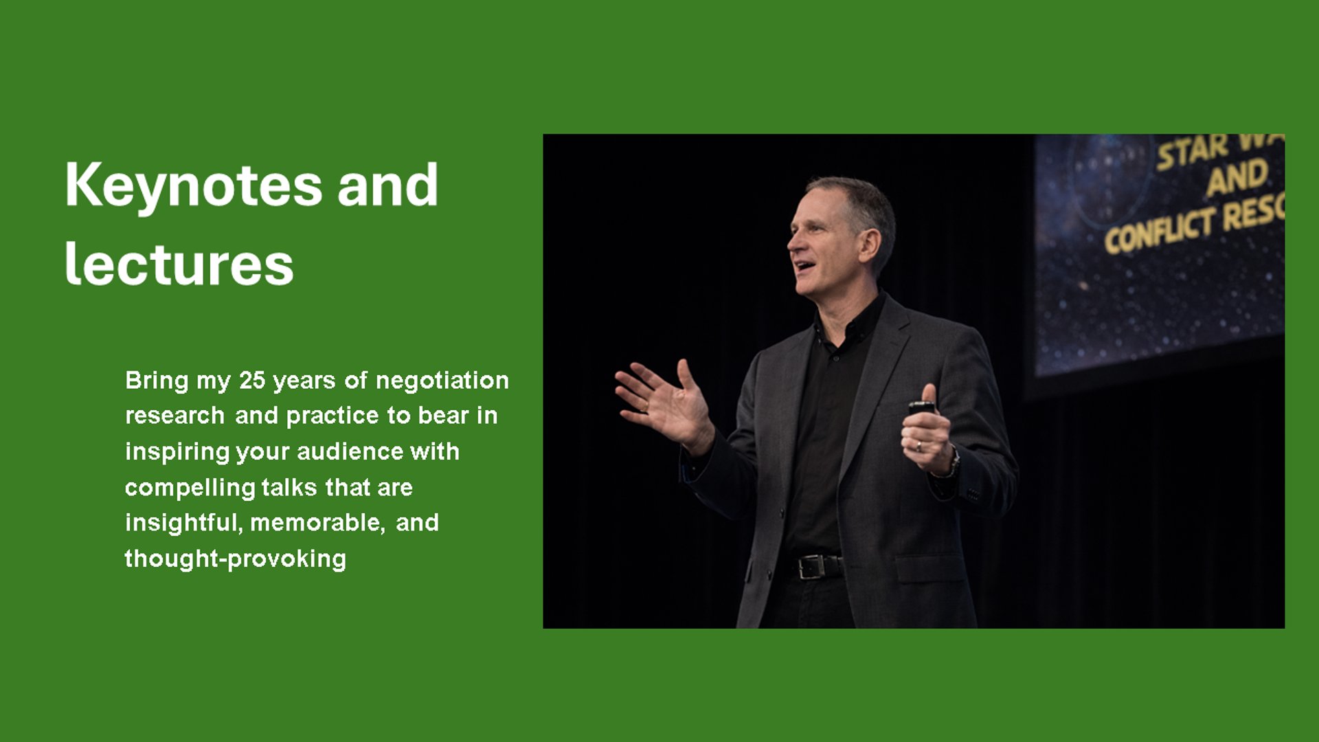 Whether on stage, in a workshop, helping work through conflict or preparing you for your next negotiation, my focus remains the same: helping people engage more thoughtfully, strategically, and humanely when good conversations matter most.