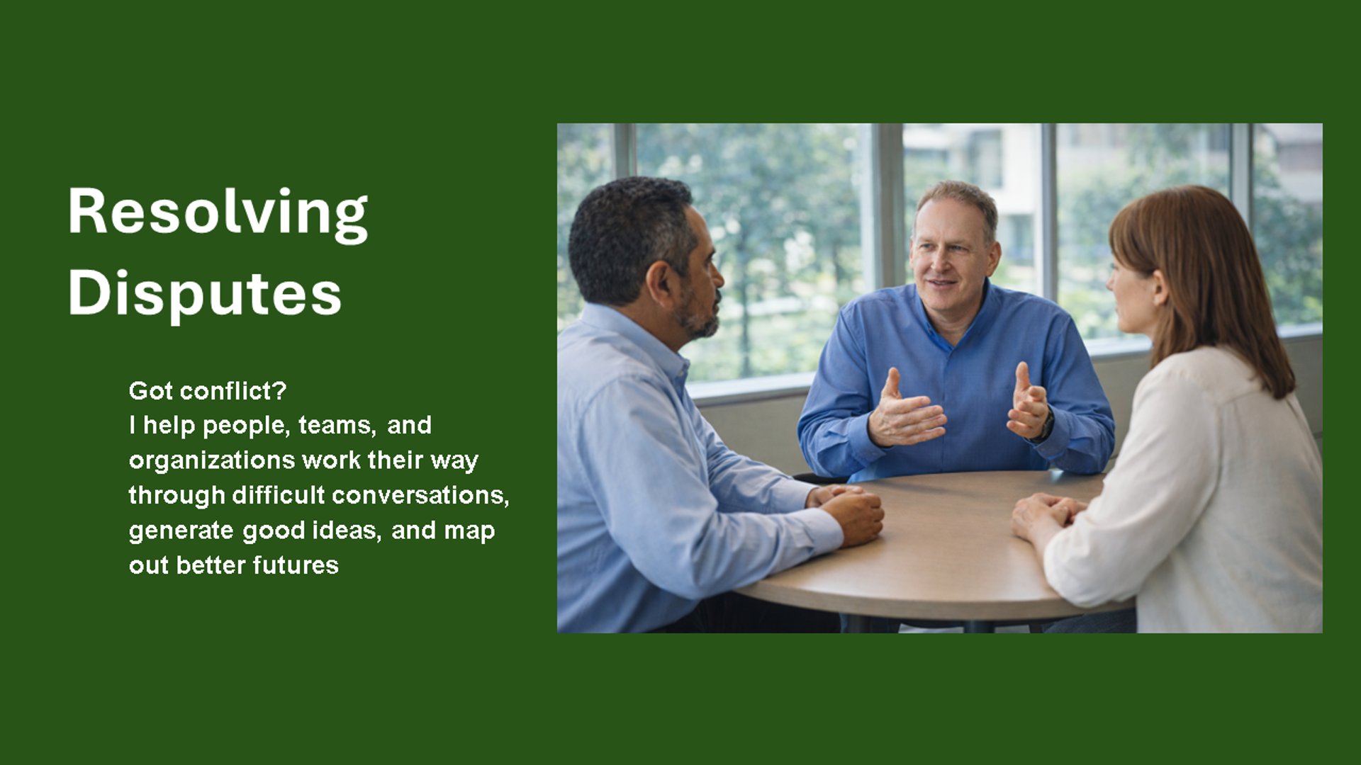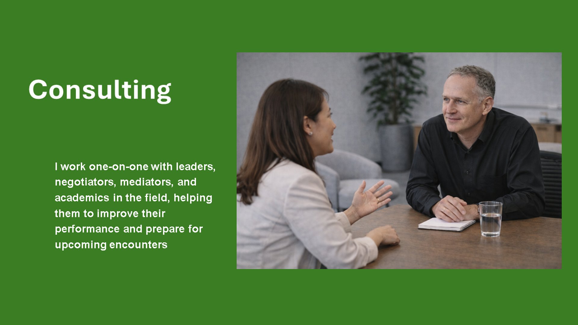 I help individuals and organizations improve at having the conversations that matter most—whether they’re negotiating, navigating conflict, or mapping out joint new futures.