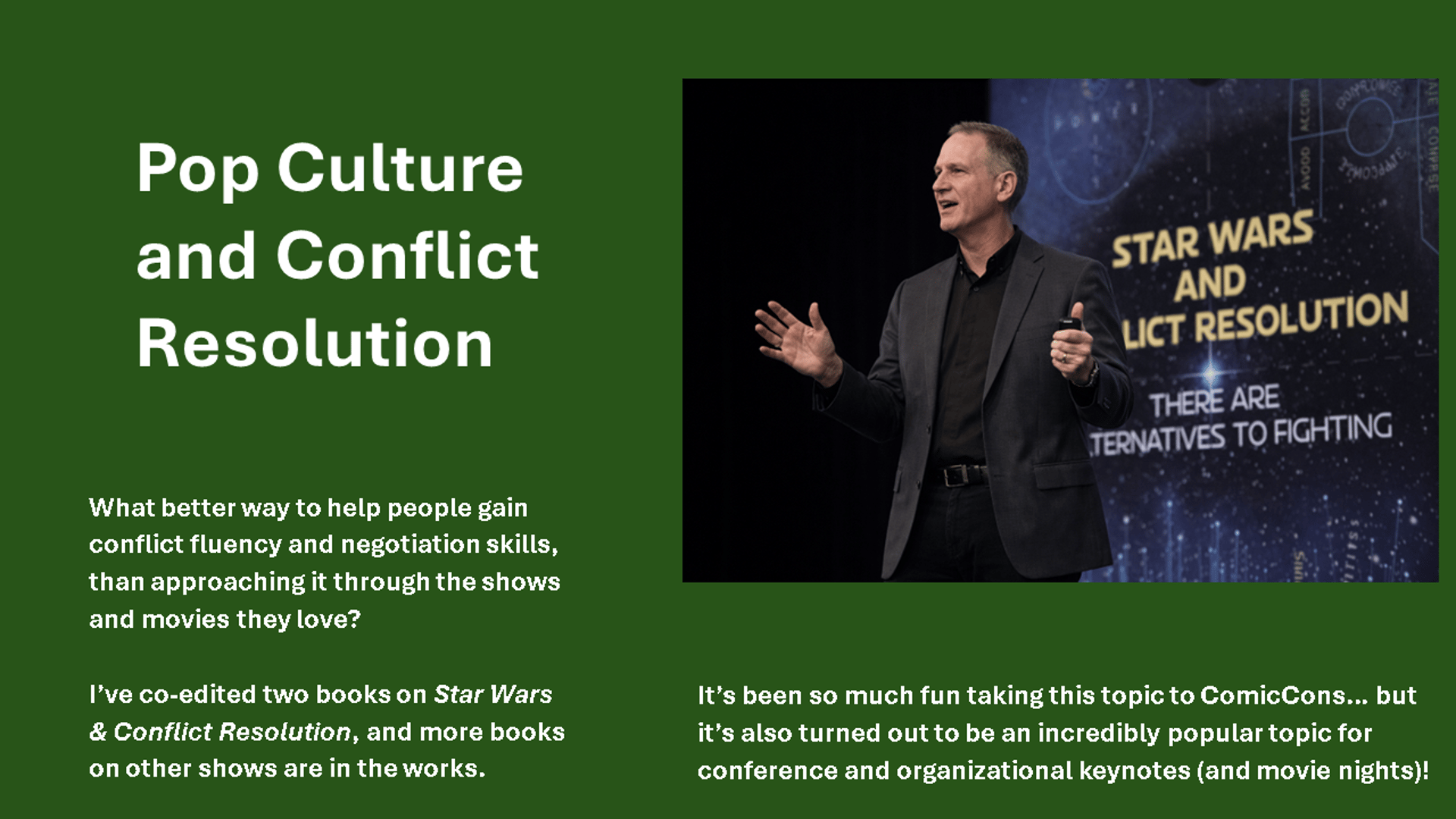 I’ve been in the conflict and resolution field for over 25 years. In a nutshell, I’ve resolved disputes, consulted to organizations, and taught negotiation and conflict resolution skills to thousands of people around the world.