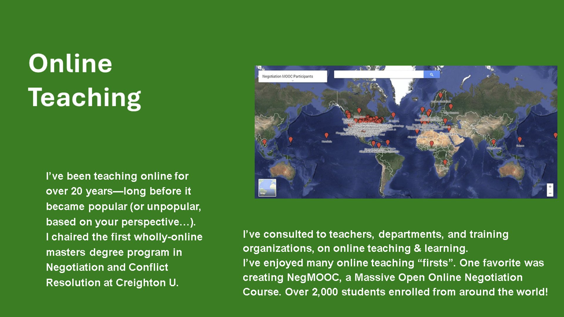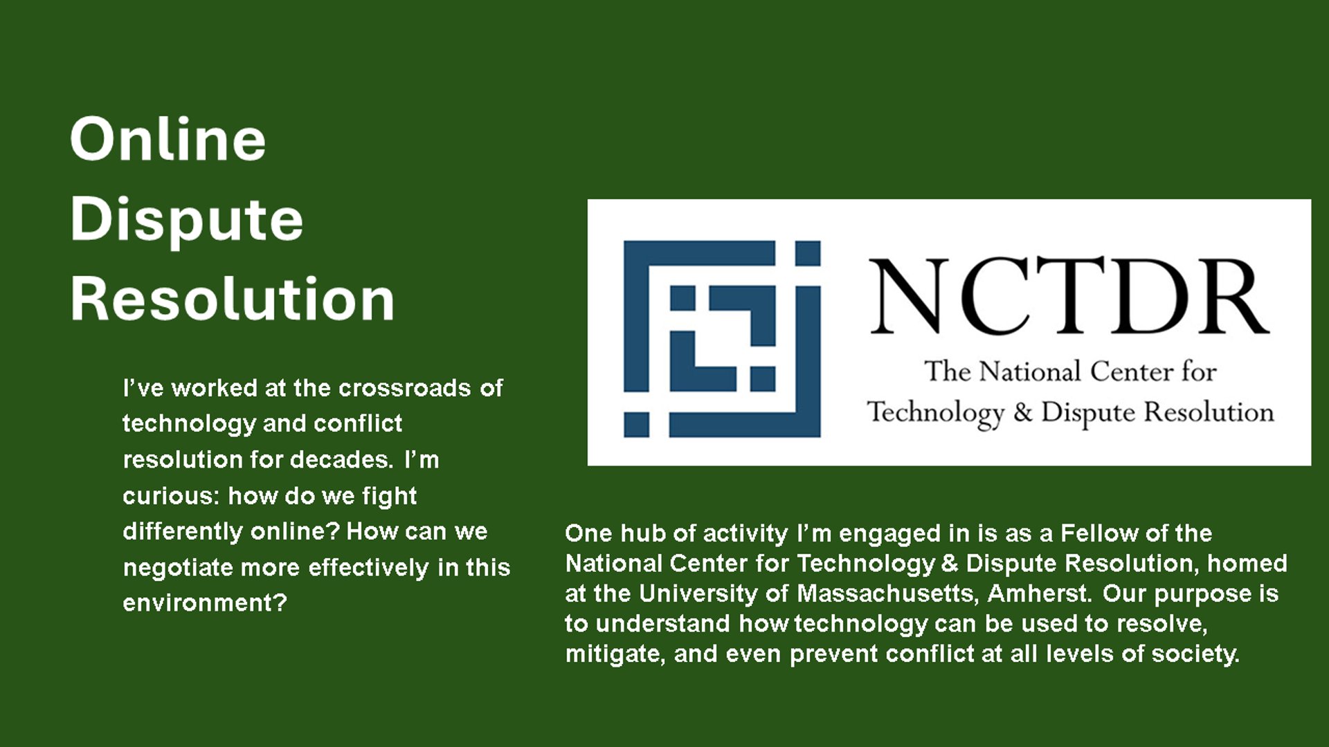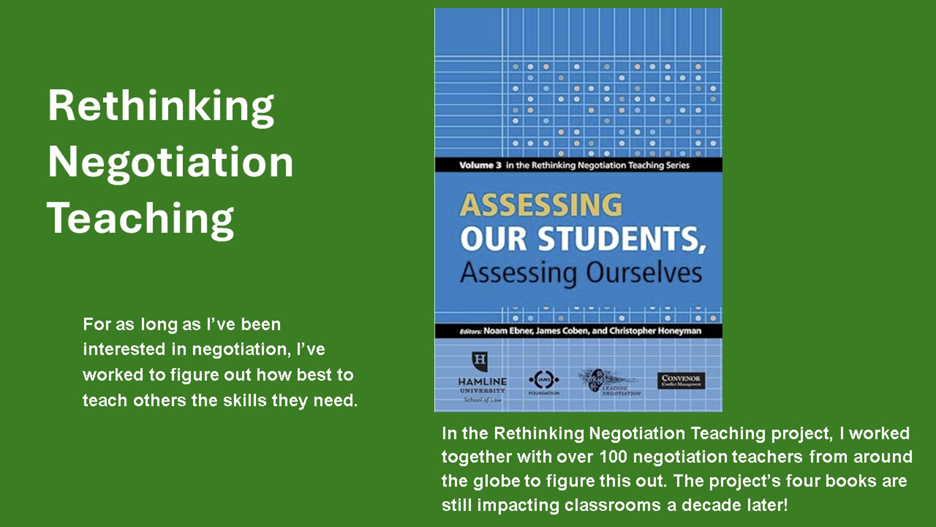 To give you a better sense of my interests and specialties, the slideshow below shows some of my favorite projects and activities in the fields of negotiation and conflict.